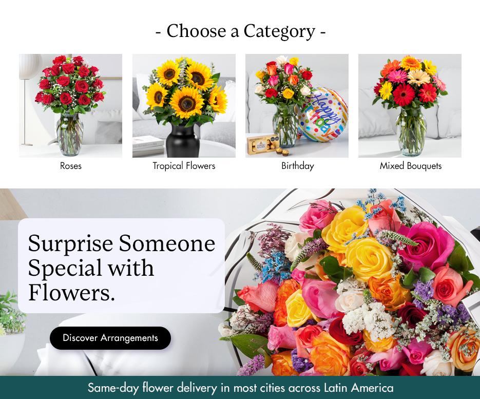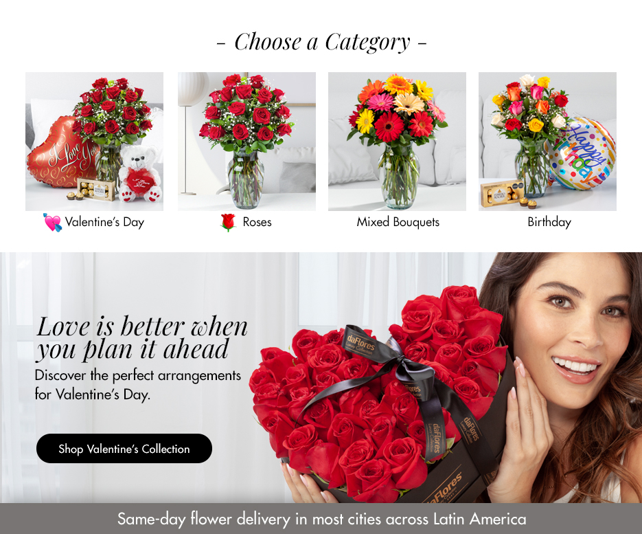 International Flower DeliveryWelcome to daFlores! We are your #1 source for international flower delivery. With several years of florist and retail experience, our family owned business can send you flowers to nearly anywhere in Latin America. When you order flowers with us, you can expect the freshest and highest quality flowers delivered anywhere – most locations same day! With daFlores it has never been faster or easier to send roses or flowers abroad- surprise a loved one today! Same-day flower delivery to more than 4,000 cities in America and Europe. These are some of our Top Destinations: Argentina: Buenos Aires, Cordoba, Mendoza Bolivia: Santa Cruz, La Paz Brazil: Sao Paulo, Rio de Janeiro, Curitiba Colombia: Bogota, Cali, Medellin, Barranquilla, Bucaramanga, Cartagena, Pereira, Ibague, Armenia, Chile: Santiago de Chile, Viña del Mar, Valparaiso Costa Rica: San José, Heredia, Alajuela Dominican Republic: Santo Domingo, Santiago Ecuador: Quito, Guayaquil, Cuenca El Salvador: San Salvador, San Miguel, Santa Ana Guatemala: Ciudad de Guatemala Honduras: Tegucigalpa, San Pedro Mexico: México DF, Monterrey, Puebla, Guadalajara, Tijuana Nicaragua: Managua Panama: Ciudad de Panama Paraguay: Asuncion Peru: Lima, Arequipa, Trujillo Spain: Madrid, Barcelona Uruguay: Montevideo Venezuela: Caracas, Maracaibo, Valencia, Barquisimeto. |
